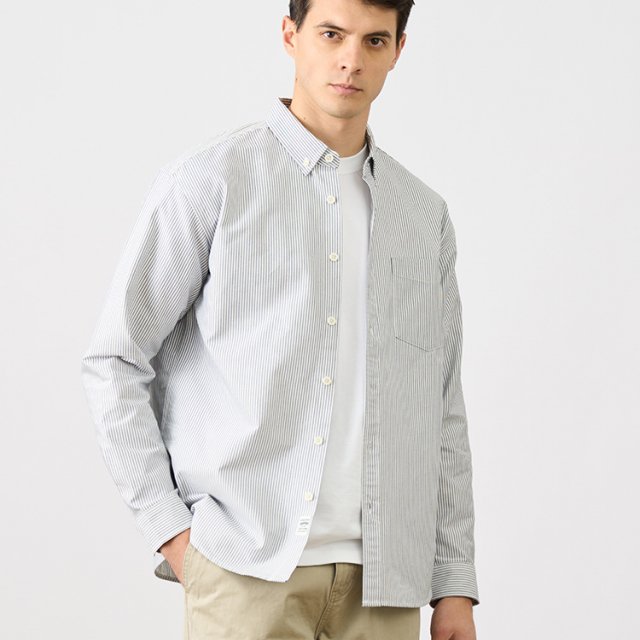 This shirt is crafted with full-length sleeves and a turn-down collar that maintains a clean, sharp appearance. The single-breasted closure adds simplicity, making it easy to pair with jeans, chinos, or casual trousers. The vertical stripes deliver a flattering, elongating effect that enhances your overall silhouette. Built with a tatting-weave Oxford fabric at 210gsm, it offers a comfortable amount of thickness ideal for autumn and winter.