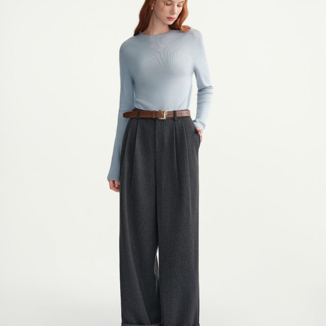 The thoughtful pleated design adds a touch of sophistication while enhancing comfort and movement. The half-elastic waist offers flexibility without sacrificing elegance, ensuring a smooth silhouette. These pants combine simplicity with refinement, making them a reliable go-to piece in any everyday wardrobe. Their solid gray color pairs effortlessly with sweaters, blouses, long coats, and winter layers.